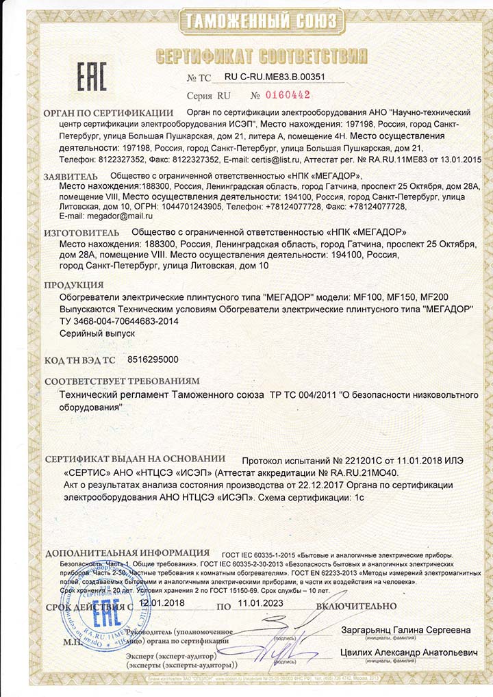 | Производитель и его адрес | ООО НПФ МЕГАДОР, 188300, Россия, Ленинградская обл, Гатчинский р-н, г Гатчина, пр-кт 25 Октября, 28А, 8 |